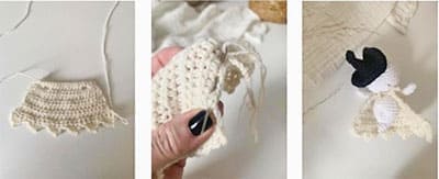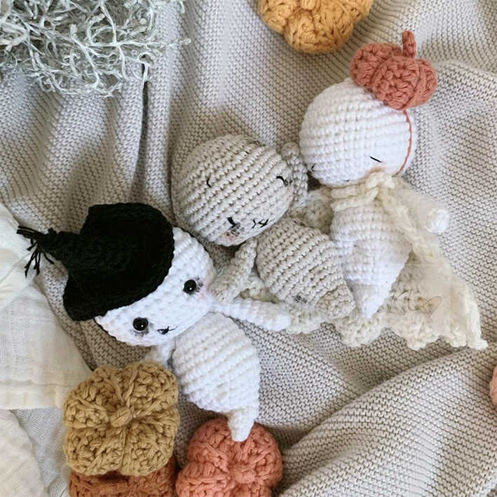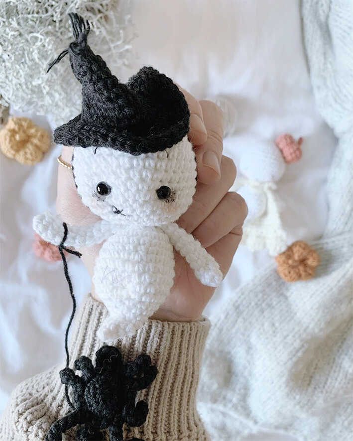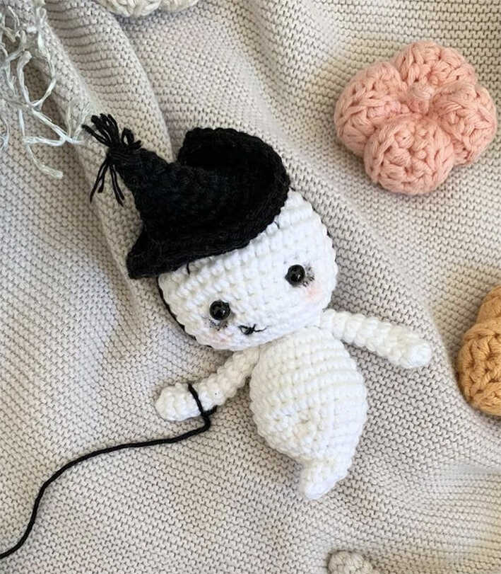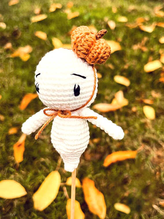 Make a loop, make 6 ch and 5 sl st. Secure the thread, place the pumpkin on the ghost’s head and sew.