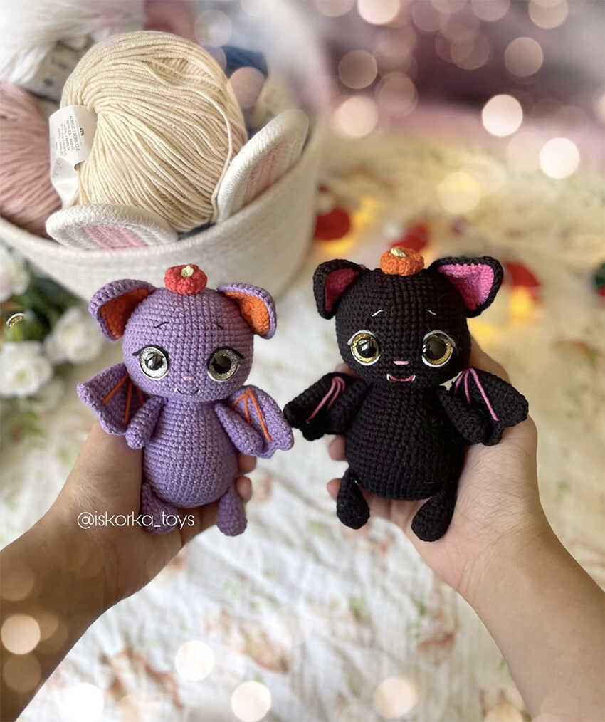This free mini bat amigurumi pattern is designed by Veronika Romanova (@iskorka_toys) and brings a whimsical character to life with bright colors and expressive details. With its playful wings and glitter eyes, this little bat works beautifully for DIY crochet gift ideas, seasonal décor, or cute desk companions. Its compact design and clean shaping make it a fun choice for easy crochet projects and low sew amigurumi patterns. We sincerely thank the designer for sharing this charming creation, and you will also find additional bat-themed amigurumi ideas at the end of the pattern for extra inspiration.